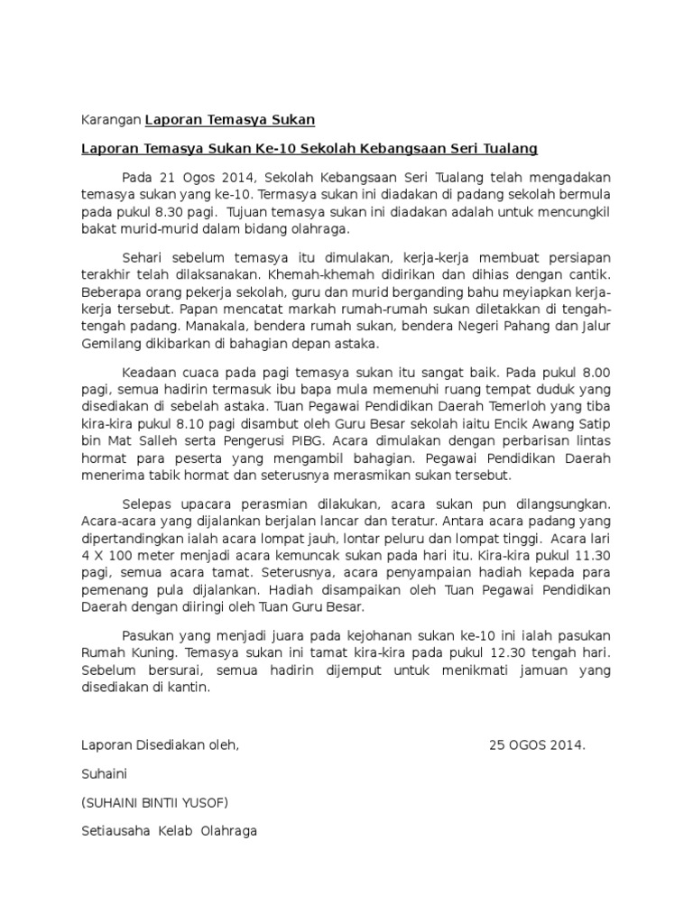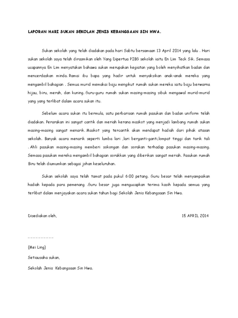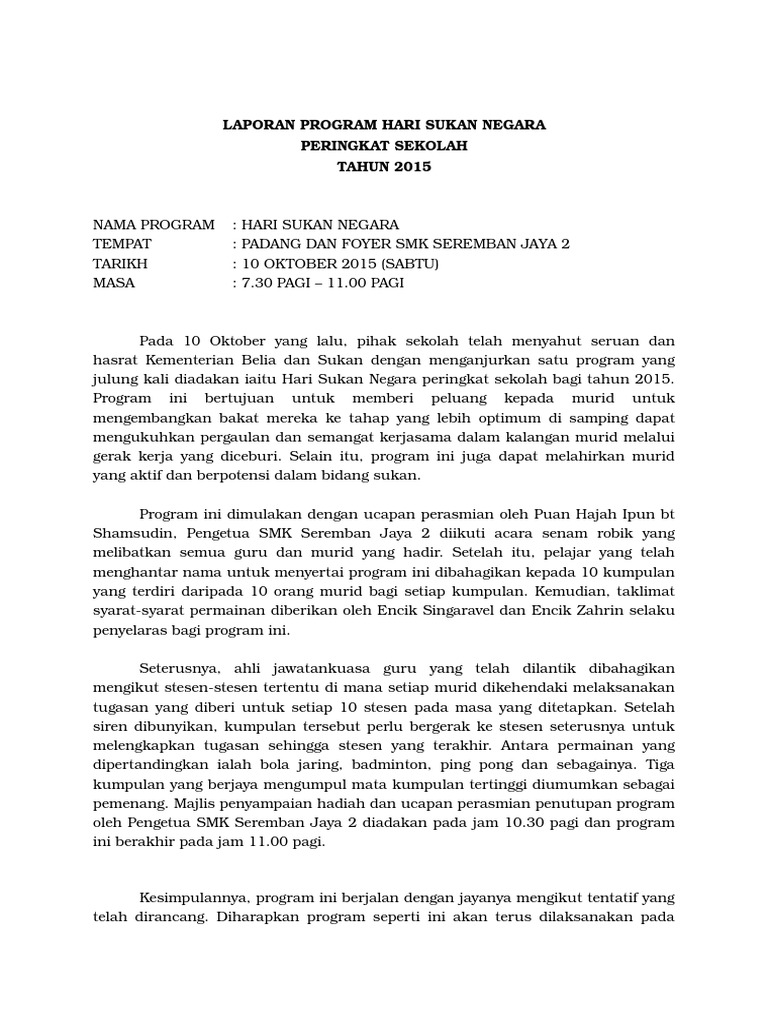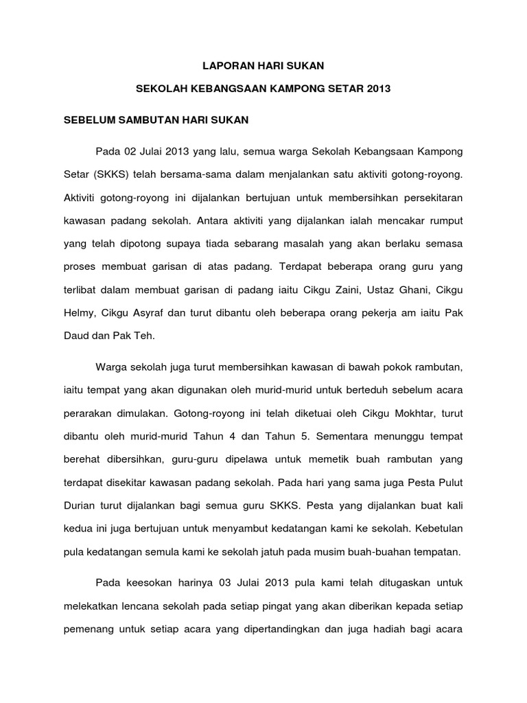 Tujuan hari sukan ini diadakan adalah untuk melahirkan atlet-atlet yang berpotensi tinggi pada peringkat sekolah. LAPORAN HARI SUKAN NEGARA PERINGKAT SEKOLAH SK SKAROK 2016 NAMA SEKOLAH. Contoh Karangan Laporan Hari Sukan Sekolah - Contoh Karangan Hari Sukan Contoh Xis Theme Golden Otosection.