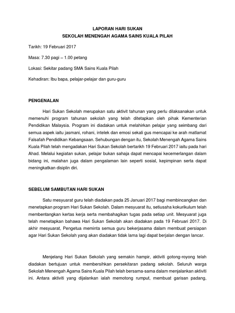 Laporan Hari Sukan di Maktab Rendah Sains Mara MRSM Balik Pulau 2020 Pada tanggal 2 hingga 4 Mac 2020 yang lalu Maktab Rendah Sains Mara telah mengadakan. Laporan Hari Sukan Sekolah Pdf from imgv2-1. Laporan hari sukan sekolah kebangsaan ulu ranan 2014 sekolah kebangsaan ulu ranan da pejabat pendidikan daerah kanowit 96700 kanowit laporan hari sukan.